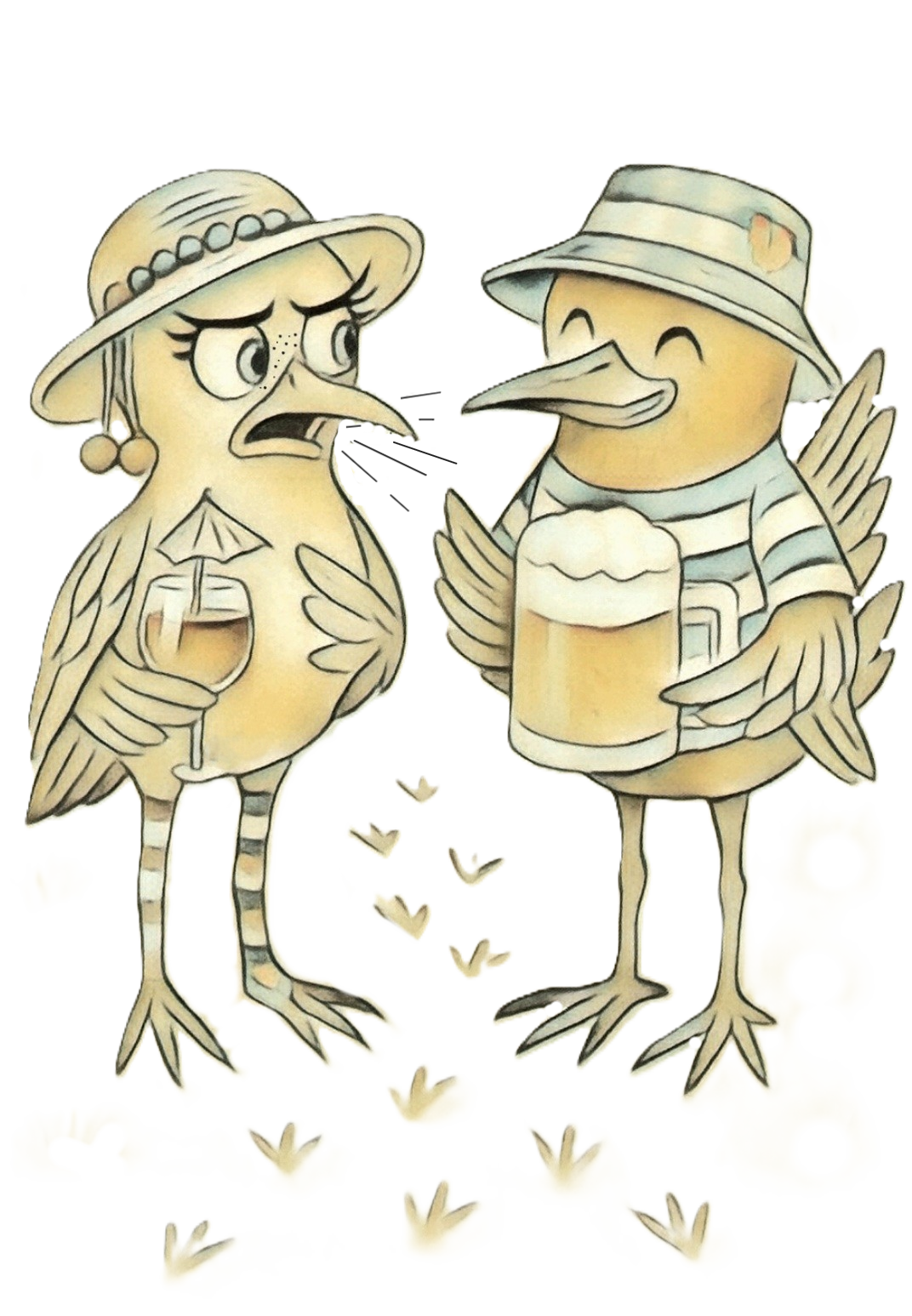 Am nächsten Tag, machten sich die beiden auf den Weg zu ihren Dünen. Ihr Strandlopersong dudelte rauf und runter. Sie waren sich allerdings einig, dass das Lied noch verbesserungsfähig war. Und dann ging die Phantasie mit ihnen durch… “Stell Dir doch nur mal vor, es gäbe T-Shirts auf denen die beiden kleinen Strandloper rumpurzeln, lopen und meckern?!” “Ooooh das wäre schön! Und überall kleine Fußtapser!” “Und, und, und…” Und so wurde den beiden Strandlopern so langsam Leben eingehaucht.